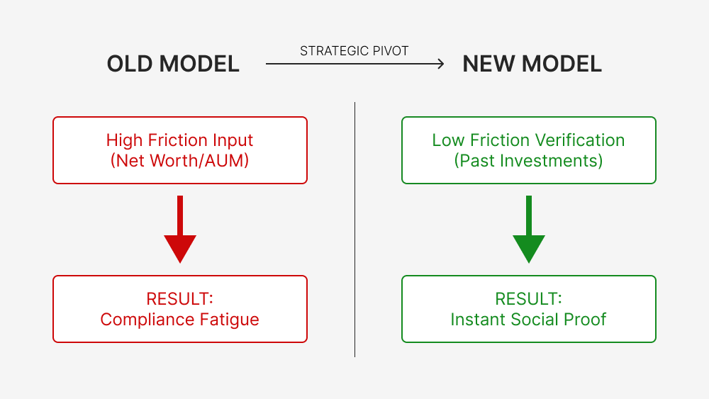 We executed a strategic pivot from Abstract Preferences (what users might do) to Verifiable Relationships (what users have done). By mapping the network of Investors (LPs) to Sponsors (GPs), we turned the onboarding friction into the platform's primary data engine.