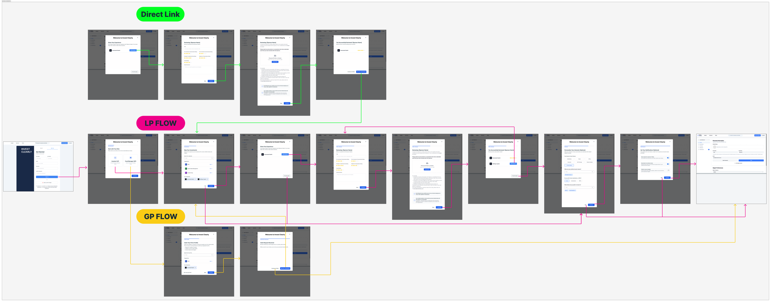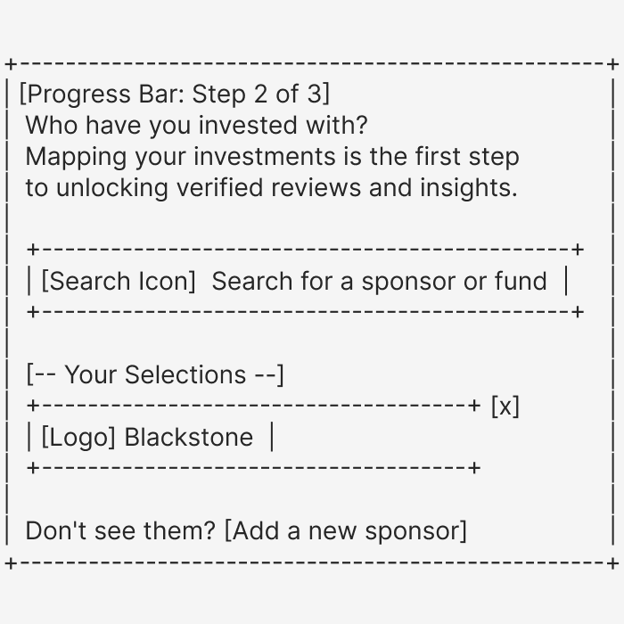 // SYSTEM INSTRUCTIONS:Create a 3-screen wireframe flow based on the following logic.// 1. GLOBAL STYLES (The "Trust" Palette)Color Palette: Primary Blue (#3E84F4), Dark Text (#172C36), Background (#F1F5F9).Layout: All content must exist within a single, centered white card with soft shadow.Header: Persistent top nav with "INVEST CLEARLY" logo and "Write a Review" button.// 2. SCREEN LOGICScreen 2: LP Flow - GP Selector (The Core Value)- Goal: Map LP-to-GP relationships.- Progress Bar: "Step 1: Role" complete -> "Step 2: Map Investments" active.- Search: Full-width bar with placeholder "Search for a sponsor or fund..."- Logic A (Selections): Show selected items as cards with logos (e.g., Blackstone [x]).- Logic B (Edge Case): Include link text "Don't see them? Add a new sponsor."